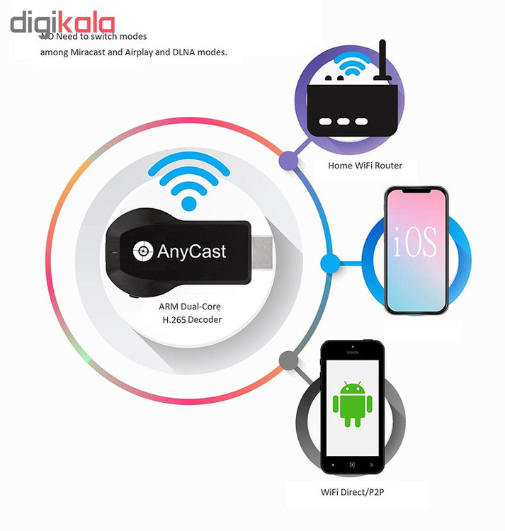 دانگل HDMI انی کست Anycast M100 جدیدترین نوع محصولات دانگل انی کست می باشد که به تازگی به ایران راه یافته است . این محصول با قابلیت اتصال همزمان به چند دستگاه جهت انتقال تصویر و صدا از تلفن های همراه با سیستم عامل های ios و android و لب تاپ و ..بر روی صفحه نمایش تلویزیون یا سایر دستگاه های دارای پورت HDMI با سرعت بالا و کیفیت فوق العاده 4K می باشد . دانگل WiFi انی کست با استفاده از تکنولوژی بی سیم وای فای به موبایل شما متصل شده فرمت های ویدئویی AVI, DIVX, MKV, DAT, VOB, MPG, MPEG, MOV, MP4, RM, RMVB, WMV و صوتی MP3 – WMA – WAV – OGG – AAC - FLAC و حتی عکسهایی با فرمت JPG – BMP - PNG را بر روی صفحه بزرگ تلویزیون با ابعاد مختلف نمایش می دهد. بدیهی است که این دانگل از لحاظ نرم افزاری و سخت افزاری ارتقاء قابل توجهی یافته است . دانگل M100 دارای CPU ی Dual core AM8272 1.6Ghz و OS Linux 3.0.8 است و دارای حافظه رم DDR3: 128MB و از طریقDLNA, Airplay Miracast به ایجاد ارتباط بی سیم میان دستگاههای مختلف و تلویزیون می پردازد. و سازگار با سیستم عامل های (iOS 9+, Android 4.4+, Mac OS and Windows(must be miracast enabled است . و از تمامی کیفیت ها و رزلوشن های 3840*2160_30P, 1920*1080_60P, 1280*720_60P و 4K پشتیبانی می کند و اندازه تمام صفحه به شما می دهد هر چند که اندازه صفحه توسط خود شما قابل تغییر است هم چنین از 21 زبان زنده دنیا نظیر انگلیسی ، اسپانیایی ، فرانسوی ، ترکی و ... پشتیبانی می کند و با اتصال ان به اینترنت قابلیت به روز شدن از اخرین تغییرات نرم افزاری را داراست.