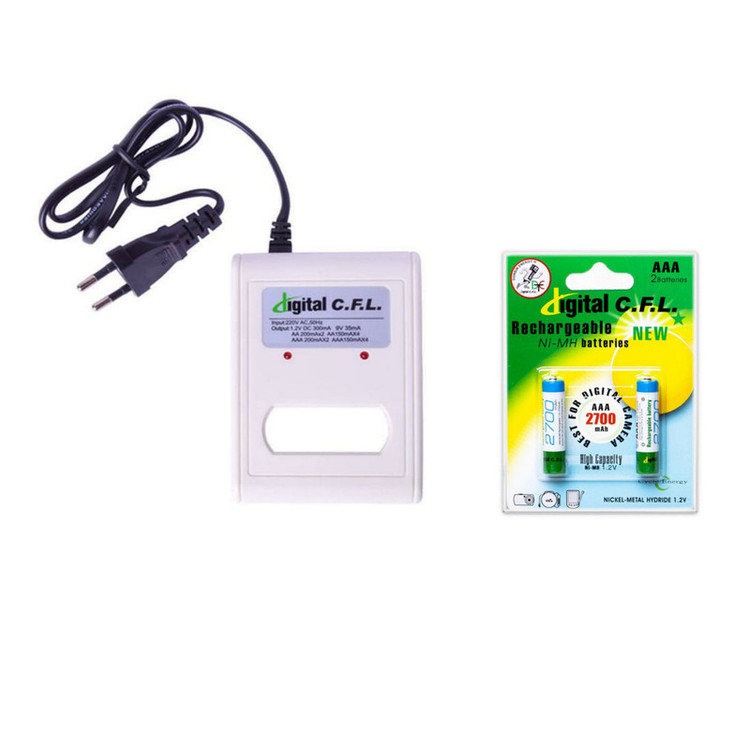 این پکیج شامل یک جفت باتری نیمقلمی (AAA) قابل شارژ با ظرفیت 2700 میلیآمپر ساعت نیز میباشد که از برند معتبر CFL بوده و برای استفادههای روزمره بسیار مناسب است. همراه بودن باتری با شارژر باعث صرفهجویی در هزینه و زمان خرید جداگانه میشود.