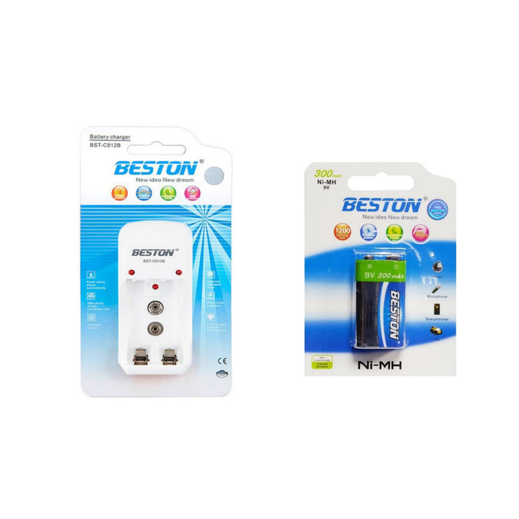 شارژر باتری بستون مدل C812B به همراه باتری کتابی قابل شارژ 9 ولت 300 میلی آمپر ساعت Ni-MH