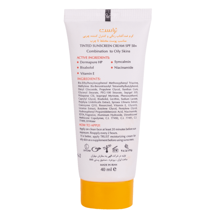 کرمهای ضدآفتاب رنگی تراست با SPF50+ از مرغوبترین و جدیدترین مواد اولیه موثره دارای حداکثر حفاظت دربرابر پرتوهای مضر خورشید ساخته شدهاند؛ این کرم با وجود بهرهمندی از بافتی سبک، دربرابر آسیبهای وارده توسط نور خورشید به خوبی از پوست محافظت و با مهار رادیکالهای آزاد از تخریب سلولهای پوستی جلوگیری میکند. همچنین با مصرف این محصول، بدون بسته شدن منافذ پوستی و ایجاد خلل در تنفس سلولهای پوستی، ضمن کنترل چربی، پوستتان آبرسانی میشود.