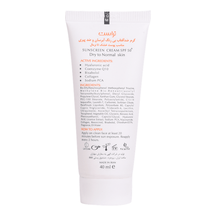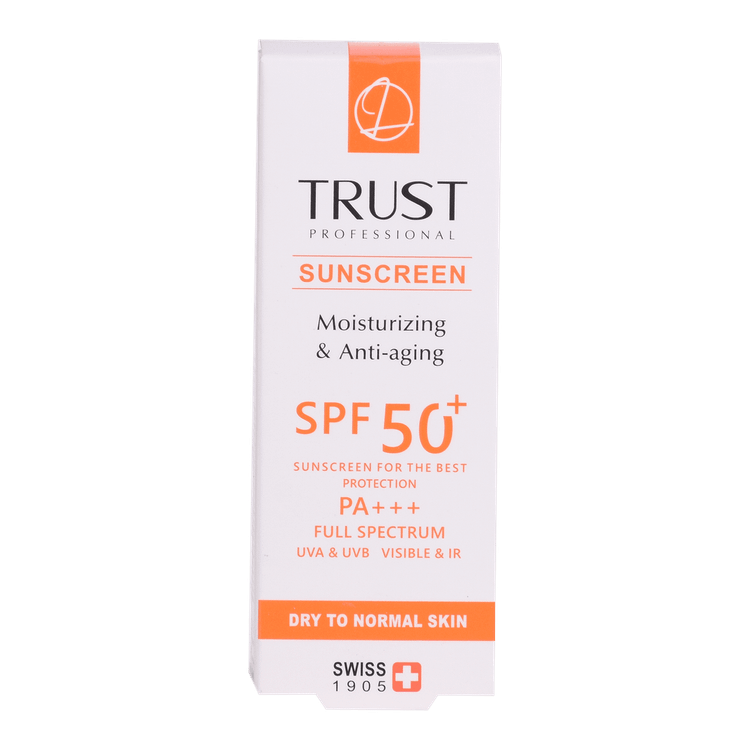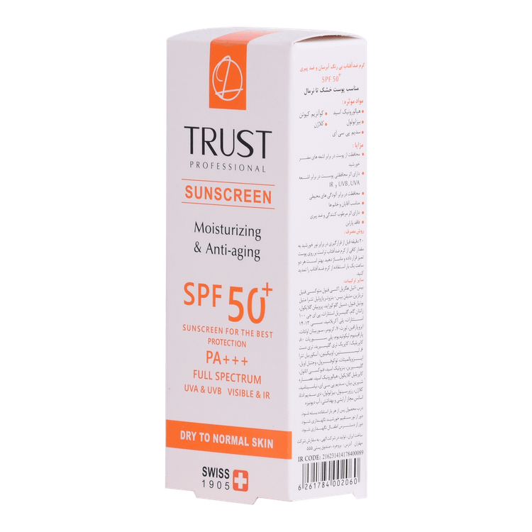 کرم ضدآفتاب و ضدپیری SPF +50 تراست، با استفاده از مرغوبترین و جدیدترین مواد اولیه همچون هیالورونیک اسید و کوآنزیم کیوتن از پوست شما دربرابر پرتوهای مضر آفتاب به طور کامل محافظت میکند. این کرم علاوه بر مهار رادیکالهای آزاد و محافظت از پوست دربرابر آلودگیهای محیطی، از تخریب سلولهای پوستی، بروز چینوچروک، پیری زودس و لکهای ناشی از آفتاب نیز جلوگیری میکند. این محصول بافتی سبک داشته و با قابلیت جذب سریع و آبرسانی قویِ پوست خشک و حفظ رطوبت آن، پس از مصرف منافذ پوستی را نبسته و هیچ خللی در روند تنفس سلولهای پوستی ایجاد نمیکند.