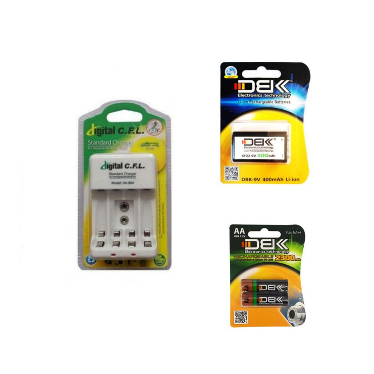 در کنار شارژر، یک عدد باتری کتابی ۹ ولت DBK با ظرفیت ۴۰۰ میلیآمپر ساعت و همچنین یک جفت باتری قلمی DBK با ظرفیت ۲۳۰۰ میلیآمپر ساعت قرار دارد که هر دو برای استفادههای خانگی، کنترلی، صوتی و تصویری مناسب هستند. این مجموعه میتواند یک انتخاب ایدهآل برای کاربران خانگی، فنی و فروشگاههای قطعات باشد.