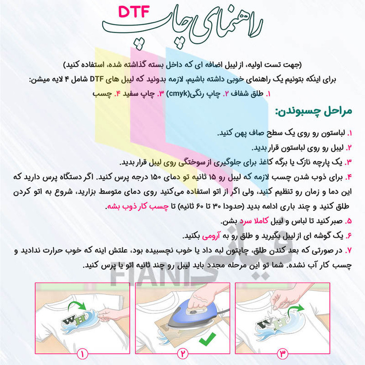 زمانی که شما به دنبال زیبا کردن لباس هاتون هستید، قطعا بهترین گزینه استفاده از برچسب های dtf هست . صنعت چاپ dtf (direct to film)، بروزترین شیوه چاپ لباس میباشد که به نسبت چاپ افست(برچسبی)، سیلک (زول، پیگمنت و اورینت) و چاپ کاتری مقاومت و ماندگاری بیشتری دارد. این برچسب ها توسط دستگاه صنعتی چاپ dtf عرض 60 سانتی متر با رنگ های کره ای چاپ و توزیع میشوند. بکگراند خاکستری که در گالری عکس ها مشاهده میکنید چاپ نمیشود و صرفا به این جهت گذاشته شده که تمامی رنگ های روشن و تیره کاراکتر نمایان باشد. هر کاراکتر در ارتفاع حدودی 15،20،30 سانتی متری و تعداد 4،12،24 عددی داخل دیجیکالا عرضه میشود . به تناسب بسته های با تعداد بالاتر مناسب تولیدی ها و خرازی ها میباشد و تعداد کم برای مصارف شخصی، دوستانه و خانوادگی هستند (جهت ست کردن لباس ها). برچسب های dtf قابلیت چسباندن بروی انواع پارچه و چرم مصنوعی توسط اتو یا پرس حرارتی را دارا میباشند. این لیبل ها را با عناوینی مثل لیبل حرارتی، استیکر حرارتی، برچسب لباس، برچسب حرارتی، عکس برگردون نیز میشناسند.