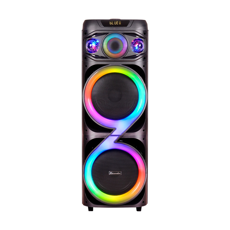اسپیکر مکسیدر CN12E09 با دو ساب ووفر ۱۲ اینچ و تیوتر، طراحی منحصر به فردی دارد که با رقص نور RGB دور سابها، هر فضایی را به تئاتر نوری تبدیل میکند. این اسپیکر شگفتانگیز با قابلیت اتصال TWS برای اتصال دو دستگاه مشابه، بلوتوث ۵.۰، ورودی AUX، USB و کارت حافظه، میکروفون و ورودی گیتار، تجربهای بینظیر از موسیقی و نور را ارائه میدهد. با باتری 12V/7Ah و چرخهای مقاوم، این اسپیکر به راحتی قابل حمل است. سیستم کارائوکه، افکتهای دیجی، و میکروفون بیسیم، امکانات ویژهای را فراهم میکنند. طراحی مقاوم با توری فلزی و پنل ABD، امنیت و استحکام این دستگاه را تضمین میکند.
