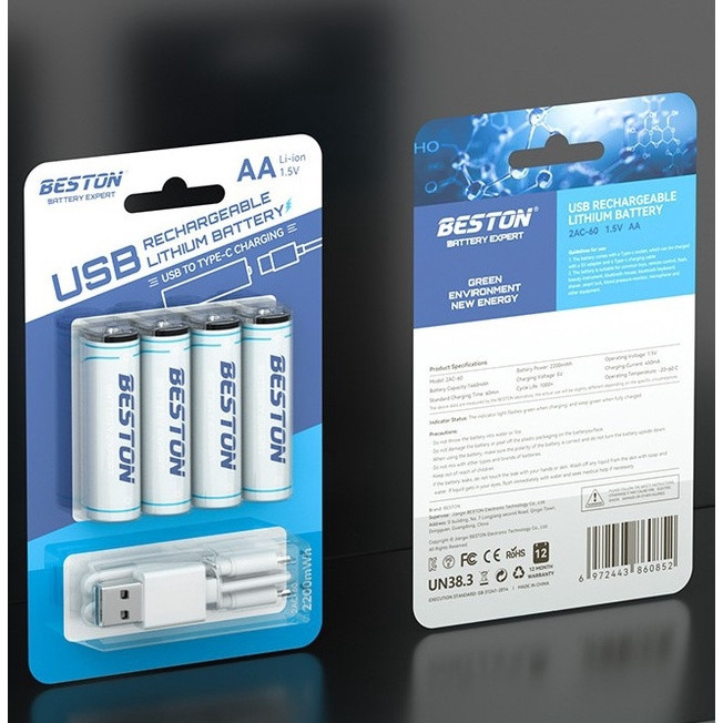 باتری قلمی قابلشارژ بستون مدل USB‑TYPE C Charging، بستهای کاربردی شامل چهار عدد باتری AA است که برای اولین بار امکان شارژ مستقیم از طریق کابل USB‑C را فراهم کرده. با ظرفیت اسمی ۲۲۰۰ میلیآمپرساعت و ولتاژ ۱.۵ ولت، این باتریها علاوهبر شارژ با شارژرهای معمولی، توسط انواع آداپتور، پاوربانک یا لپتاپ نیز قابل شارژ هستند. طراحی هوشمند آن شامل LED داخلی (در برخی مدلها) و محافظت داخلی از شارژ بیشازحد و اتصال کوتاه بوده و در هر بار شارژ تا چند صد بار قابل استفاده مجدد است.
