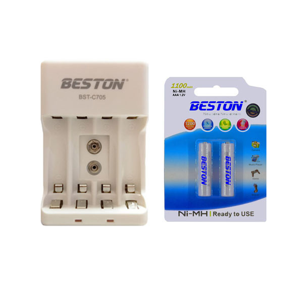 شارژر باتری بستون مدل BST-C705 همراه ۲ باتری نیمقلمی شارژی ۱۱۰۰mAh