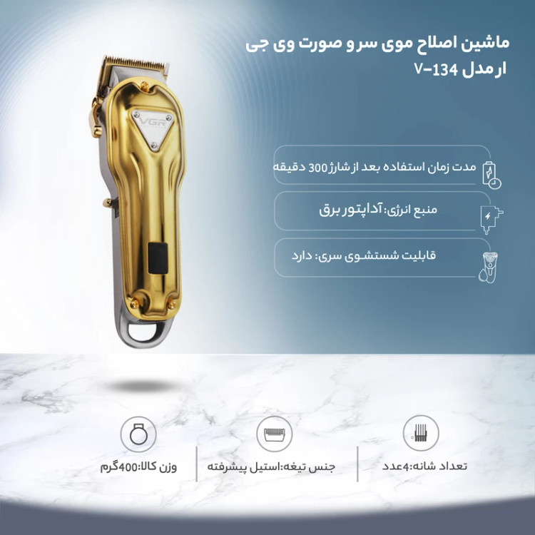 اگر به دنبال یک ماشین اصلاح قدرتمند، بادوام و خوشدست برای استفاده حرفهای یا شخصی هستید، ماشین اصلاح VGR مدل V-134 انتخابی بینظیر برای شماست. این دستگاه با طراحی خاص و رنگ طلایی چشمنواز، علاوه بر عملکرد فوقالعاده، جلوهای لوکس به میز کار شما میبخشد.