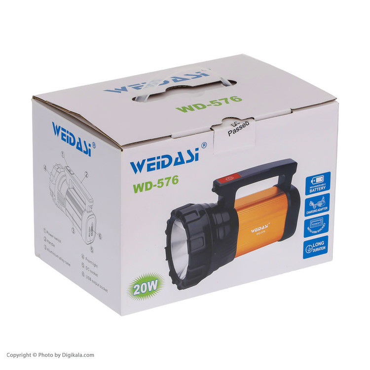 چراغ قوه دستی ویداسی مدل WD-576 یک نورافکن قدرتمند و چندکاره است که با برخورداری از لامپ LED SMD با توان ۲۰ وات، نور مهتابی پرتابکننده تا فاصلههای دور را فراهم میکند. بدنهای مقاوم از ترکیب فلز و پلاستیک با طراحی ارگونومیک و وزن حدود ۱ کیلوگرم، این محصول را در استفادههای طولانیمدت، مانند نگهبانی، کمپینگ یا امداد و نجات، بسیار مناسب ساخته است. باتری داخلی قابل شارژ این چراغ قوه با امکان شارژ از طریق پورت USB یا آداپتور، تا ۵ ساعت در حالت پرنور و حدود ۸–۱۰ ساعت در حالت کمنور و در برخی منابع تا ۱۰ ساعت عملکرد مداوم ارائه میدهد. علاوه بر این، برخی نسخهها امکان استفاده بهعنوان پاوربانک برای شارژ موبایل را نیز دارند.
