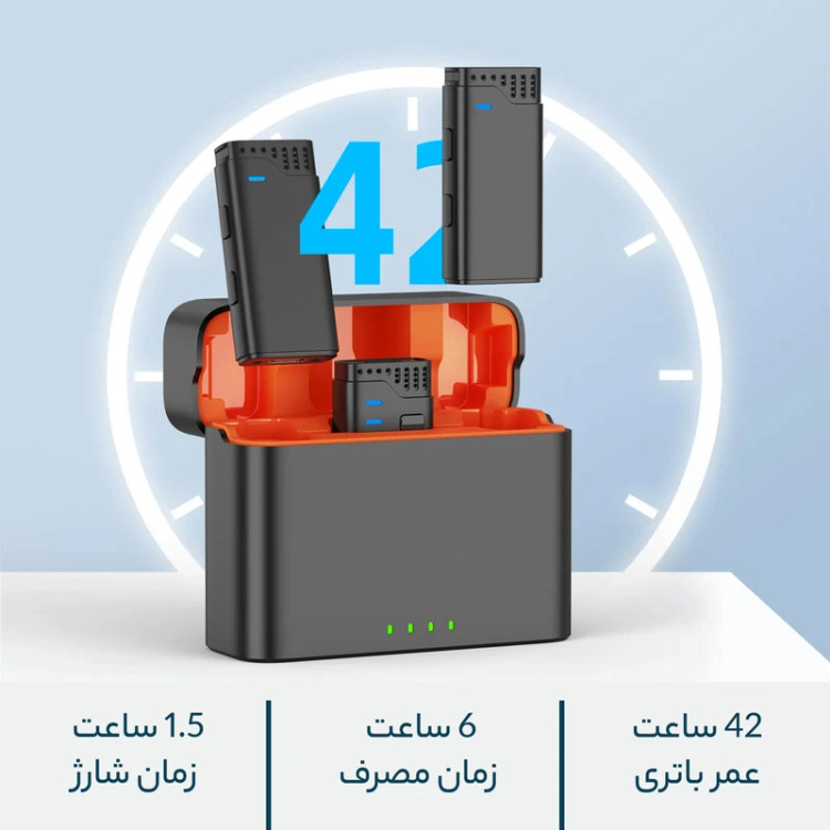 باتری فرستنده با ظرفیت 80 میلیآمپر تا ۶ ساعت استفاده مداوم را تضمین میکند و کیس شارژ 800 میلیآمپری امکان شارژ مجدد و افزایش شارژدهی تا ۴۲ ساعت را فراهم میسازد. تکنولوژی بیسیم 2.4 گیگاهرتز، نویز کنسلینگ و تاخیر کمتر از ۲۰ میلیثانیه، صدایی شفاف و بدون نویز محیطی ارائه میدهد.