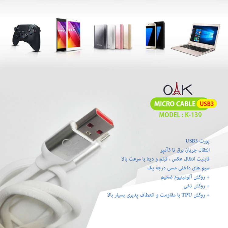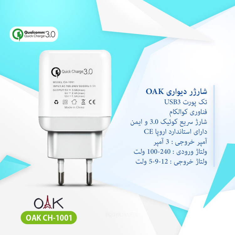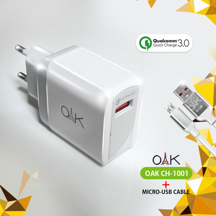 برند OAK جزو برندهای جدید در بازار لوازم جانبی بشمار میرود اما در همین مدت نسبتا کوتاه توانسته با تولید محصولات با کیفیت ، کم کم بین فروشندگان و خریدارانی که از محصولات این برند استفاده کرده اند جایگاه مناسبی بدست بیاورد و رضایتمندی مشتریان را جلب کند . این کمپانی کار خود را در بازار با فلش مموری آغاز کرد و بعد از فروش خوب و بازخورد مناسب از طرف کاربران ، پا به رقابت در دنیای لوازم جانبی موبایل گذاشت. یکی از محصولات با کیفیت و جدید این کمپانی ، شارژر دیواری OAK CH1001 همراه با کابل MICRO-USB K-139 است. این شارژر با خروجی تک پورت از نوع USB3 و با بهره گیری از فناوری روز کوالکام QUICK CHARGE 3.0 توان خروجی 3.0 آمپر را برای شارژ سریع و ایمن فراهم می کند. همچنین این شارژر دارای سیستم ایمنی در برابر فشار بالا ، دمای بیش از حد و نوسانات می باشد . استفاده از تکنولوژی مدار کوتاه باعث شده تا ولتاژ خروجی در این شارژر 12-5-9 ولت با بالاترین آمپر خروجی باشد. جنس بدن شارژر از پلاستیک سخت و مقاوم است. کابل همراه این شارژر مدل OAK K-139 از نوع MICRO-USB است که از سیمهای با مغذی تمام مس از جنس مرغوب و خالص ، روکش آلومنیوم ، روکش نخی و در انتها با یک لایه روکش TPU فوق العاده مقاوم اما کاملا منعطف تشکیل شده است . این کابل قابلیت شارژر با بیش از 3.0 آمپر را دارد ، و با استفاده از پورت USB3 قابلیت انتقال عکس ، فیلم ، موزیک و انواع دیتا را به لپ تاپ یا کامپیوتر و بالعکس را دارا می باشد. از این شارژر میتوانید برای انواع گوشی و تبلت با برندهای مختلف استفاده کنید. xاین محصول دارای برچسب گارانتی بلوط میباشدx
