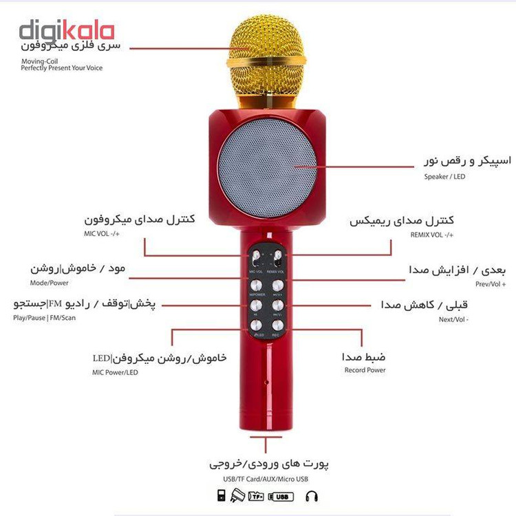 میکروفون بلوتوثی اسپیکر و رقص نور دار کارائوکه مدل وستر WS-1816 محصولی با کارایی های متنوع است که برای مجالس کوچک، میهمانی ها و جشن ها بسیار مناسب است. این میکروفون با دارا بودن اسپیکر و چراغ LED رقص نور نمایی زیبا داشته و قابلیت پخش موزیک و صدای شما را به صورت مجزا و میکس باهم دارد. از قابلیت های این محصول می توان به ضبط صدا، سیستم اکو، پشتیبانی از کارت حافظه، پشتیبانی از فلش مموری، رادیو FM، باتری 1800 میلی آمپری، اتصال به گوشی های موبایل اندروید و ios و دیگر دستگاه های پخش کننده موزیک اشاره نمود. ابعاد این محصول 7.5*7.5*27 سانتی متر و وزن آن تنها 344 گرم می باشد. رنگ بندی این محصول سفید، قرمز و طلایی می باشد که ارسال رنگ بسته به موجودی انبار می باشد. اصلی ترین کاربرد این محصول کارائوکه است که امکان هماهنگ کردن صدا با آهنگ در حال پخش می باشد.