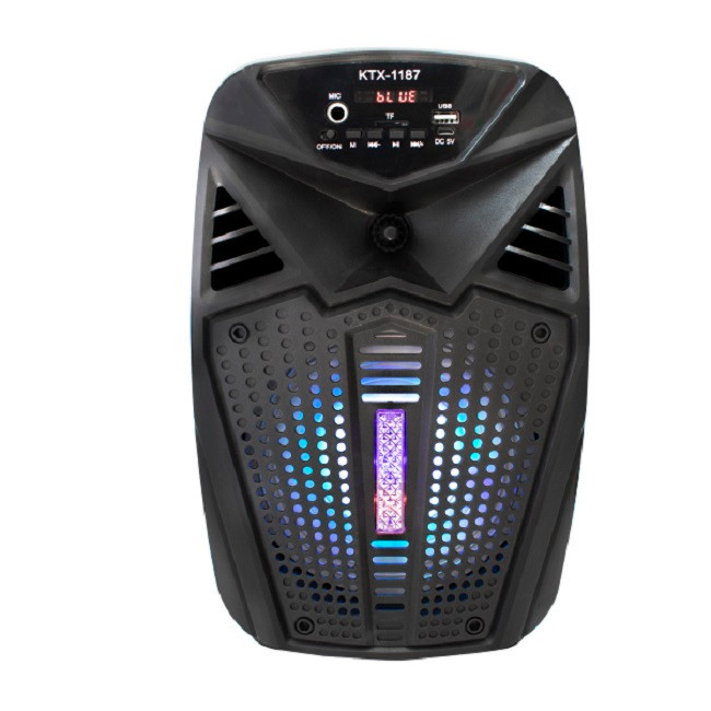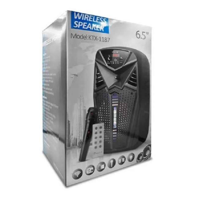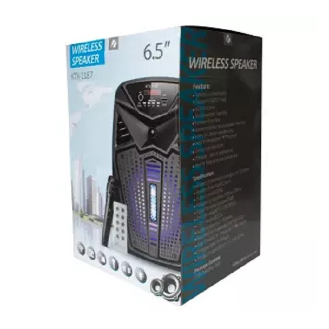 اسپیکر مدل KTX-1187 برای تولید صدای شفاف در محیط هایی که به صداهای مختلف نیاز است طراحی شده و به زبان ساده هر نوع صدایی که میتوان به صورت با کیفیت در محیط شنید را برای شما تولید میکند. اسپیکر بیسیم KTX-1187از سری بی سیم روانه بازار شده است. این اسپیکر دارای قابلیت اتصال میکروفون است که با استفاده از این قابلیت میتوانید در میکروفون خود بخوانید و صدای خود را از این اسپیکر بشنوید.این اسپیکر بیسیم دارای باتری لیتیوم یونی قابل شارژ است. با استفاده از این باتریهای قابل شارژ میتوانید این اسپیکر را در هر زمان به هر مکان که مایل هستید به همراه خود ببرید و به موسیقیهای مورد علاقه خود گوش دهید. همچنین با هربار شارژ این اسپیکر نیز میتوانید تا ساعتها از پخش موسیقی لذت ببرید.