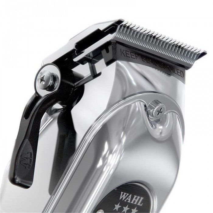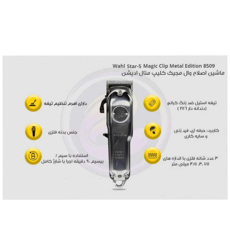 مجیک کلیپ متال ادیشن Wahl 5-Star Magic Clip Metal Edition 8509 Cord/Cordless Clipper از کلاس تجاری محصولات Wahl Professional است. ماشین اصلاح سر و صورت Magic Clip Metal برای استفاده حرفه ای در نظر گرفته شده است و عملکردی بسیار عالی و تند دارد. ماشین اصلاح مجیک کلیپ را هنگام استفاده می توان از سیم جدا نمود و هنگام تمام شدن باتری توسط سیم به برق وصل نمود. ماشین اصلاح مجیک کلیپ تیغه هایی با دقت بسیار بالا دارد که سرعت و سهولت در استفاده را برایتان رقم خواهد زد. برای راحتی شما ماشین اصلاح سر و صورت وال مجیک کلیپ با تمام لوازم جانبی مورد نیاز برای استفاده ارائه می شود. لوازم جانبی شامل راهنما، شارژر، شانه حالت دهی ، محافظ تیغه، برس تمیز کننده، روغن، دستمال و سه شانه فلزی در اندازه های 1.5 - 3 و 4.5 میلی متری است که به راحتی روی دستگاه قابل نصب اند و بسیار کاربردی مخصوصا در سایه و فید زدن می باشند. ماشین اصلاح حجم زن Wahl Magic Clip Metal دارای باتری لیتیومی است و تا 90 دقیقه میتوانید با شارژ آن کار کنید. شما می توانید بدون وقفه از ماشین اصلاح استفاده کنید و هرگاه باتری رو به اتمام بود به وسیله ی سیم به برق وصل کنید و به کار خود ادامه دهید. ماشین اصلاح سر و صورت وال متال ادیشن مجهز به موتور دوار است. ماشین اصلاح مجیک کلیپ متال ادیشن برای افرادی که مو های ضخیمی دارند بسیار مناسب می باشد زیرا با قدرت مداوم خود با مو های ضخیم مقابله می کند.