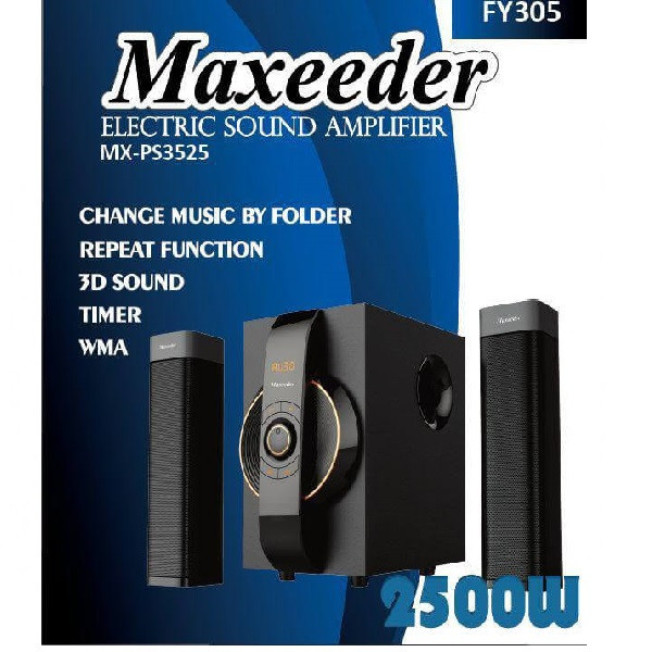 پخشکنندهی خانگی «مکسیدر» (Maxeeder) مدل «FY305» از پخشکنندههای سری «MX-PS3525» این شرکت است. بیشینهی توانخروجی آن، 2500 وات است و برای فضاهایی با متراژ کم و متوسط مناسب است؛ پورت USB، کامپوزیت و بلوتوث راههای ارتباطی این مدل هستند و از این طریق میتوان انواع موزیکها را پخش کرد. از طریق پورت USB میتوانید فلشمموری یا هارد اکسترنال خود را به اسپیکر متصل کرده و از فایلهای صوتی موجود در آن استفاده کنید؛ همچنین بلوتوث امکان انتقال بیسیم فایلهای صوتی را به اسپیکر فراهم میکند. از این طریق بهراحتی میتوانید موبایل، تبلت یا لپتاپ خود را به اسپیکر متصل کرده و فایلهای صوتی دلخواهتان را از اسپیکر پخش کنید. علاوهبر راههای مذکور، ورودی کارتحافظهی SD باعث میشود بتوانید با اتصال کارت به اسپیکر فایلهای صوتی خود را به آن منتقل کنید. پخشکنندههای سری MX-PS3525از فرمت صوتی MP3 پشتیبانی میکند. این مدل، بدون باتری طراحی شده است و منبعتغذیهی این اسپیکر از طریق اتصال به برق تأمین میشود. علاوهبر تمامی امکانات مذکور، مدل FY305دارای رادیوی داخلی است. این رادیو از موج FM پشتیبانی کرده و باعث میشود بتوانید از اسپیکرهای این پخشکننده، برنامهی رادیویی دلخواهتان را دریافت کنید. این دستگاه از دو اسپیکر تشکیل شده است که ابعاد هر یک 38x9x10 سانتیمتر و وزن هرکدام کمتر از 1 کیلوگرم است.